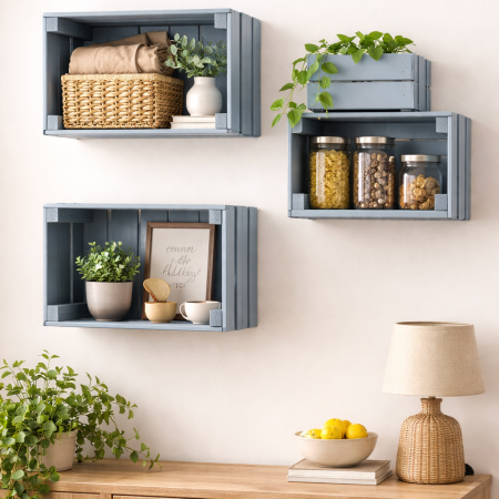 Zamiast klasycznych półek możesz wykorzystać skrzynki montowane na ścianie. To prosty sposób, aby nadać wnętrzu charakteru i stworzyć efekt, który od razu przyciąga uwagę. W zależności od potrzeb możesz stworzyć pojedyncze półki albo większą kompozycję, która będzie jednocześnie praktyczna i dekoracyjna.