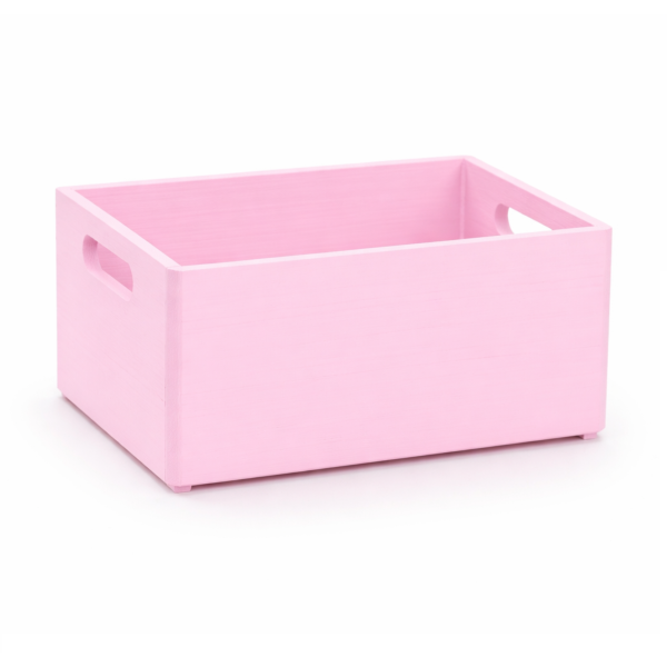 Skrzynka została wykonana z solidnego drewna sosnowego i pokryta subtelną różową warstwą akrylo-bejcy, która nadaje jej lekki i przyjemny charakter. Róż podkreśla prostą formę skrzynki i wprowadza do wnętrza ciepło oraz przytulną atmosferę, idealną do nowoczesnych, romantycznych i dziecięcych aranżacji.