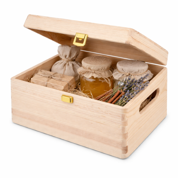 Drewniana skrzynka z deklem i zapinką – 30 × 20 × 13,5 cm