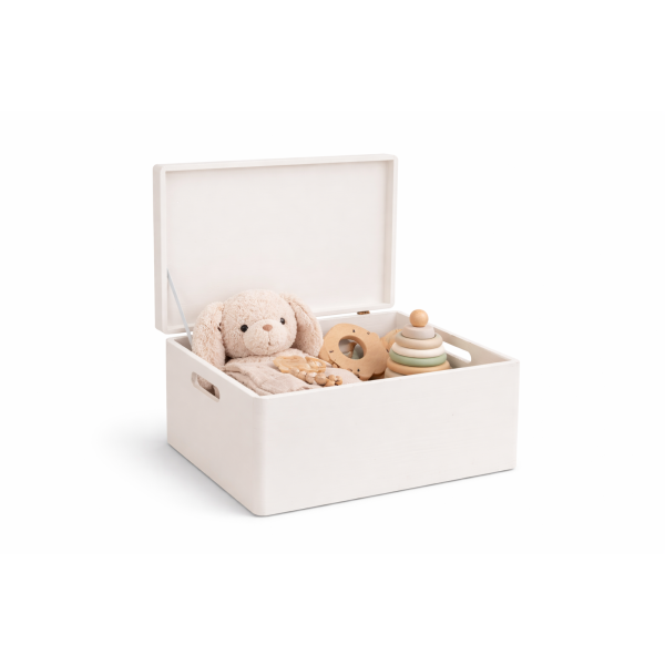 Biały kolor nadaje skrzynce lekkości i świeżości, a jednocześnie sprawia, że pasuje do każdego stylu aranżacji. Pięknie komponuje się z nowoczesnymi, skandynawskimi i dziecięcymi przestrzeniami, wprowadzając harmonię i estetyczny porządek.