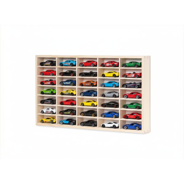 Półka posiada 35 przegródek o wymiarach 9x5x3,5 cm, które pozwalają logicznie uporządkować małe autka resoraki. Od razu widzisz całą kolekcję, bez zbędnego szukania i przekładania.