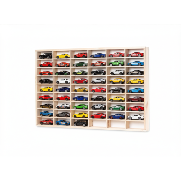 Półka posiada 80 przegródek o wymiarach 9x5x3,5 cm, które pozwalają logicznie uporządkować małe autka resoraki. Od razu widzisz całą kolekcję, bez zbędnego szukania i przekładania.