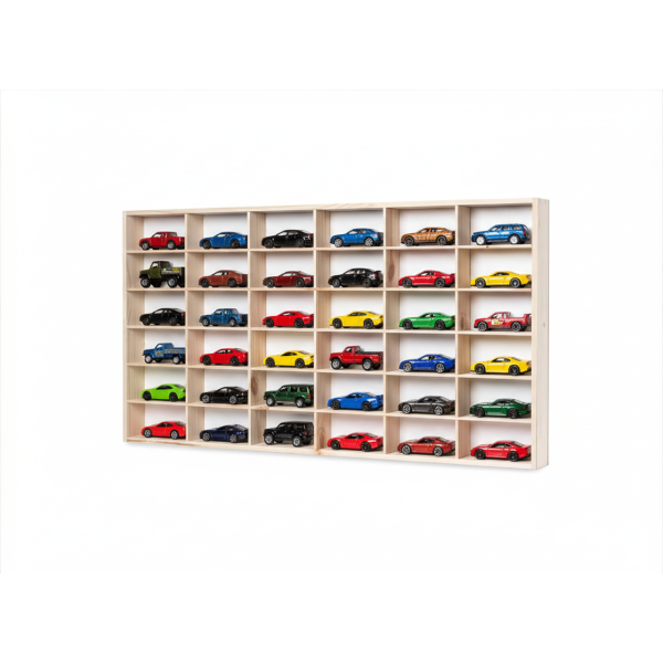 Półka posiada 36 przegródek o wymiarach 9x6x3,5 cm, które pozwalają logicznie uporządkować małe autka resoraki. Od razu widzisz całą kolekcję, bez zbędnego szukania i przekładania.