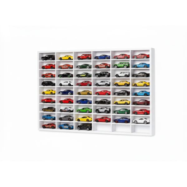 Półka posiada 54 przegródek o wymiarach 9x5x3,5 cm, które pozwalają logicznie uporządkować małe autka resoraki. Od razu widzisz całą kolekcję, bez zbędnego szukania i przekładania.
