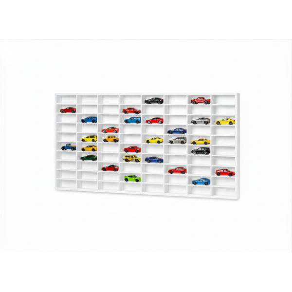 Półka posiada 80 przegródek o wymiarach 9x5x3,5 cm, które pozwalają logicznie uporządkować małe autka resoraki. Od razu widzisz całą kolekcję, bez zbędnego szukania i przekładania.